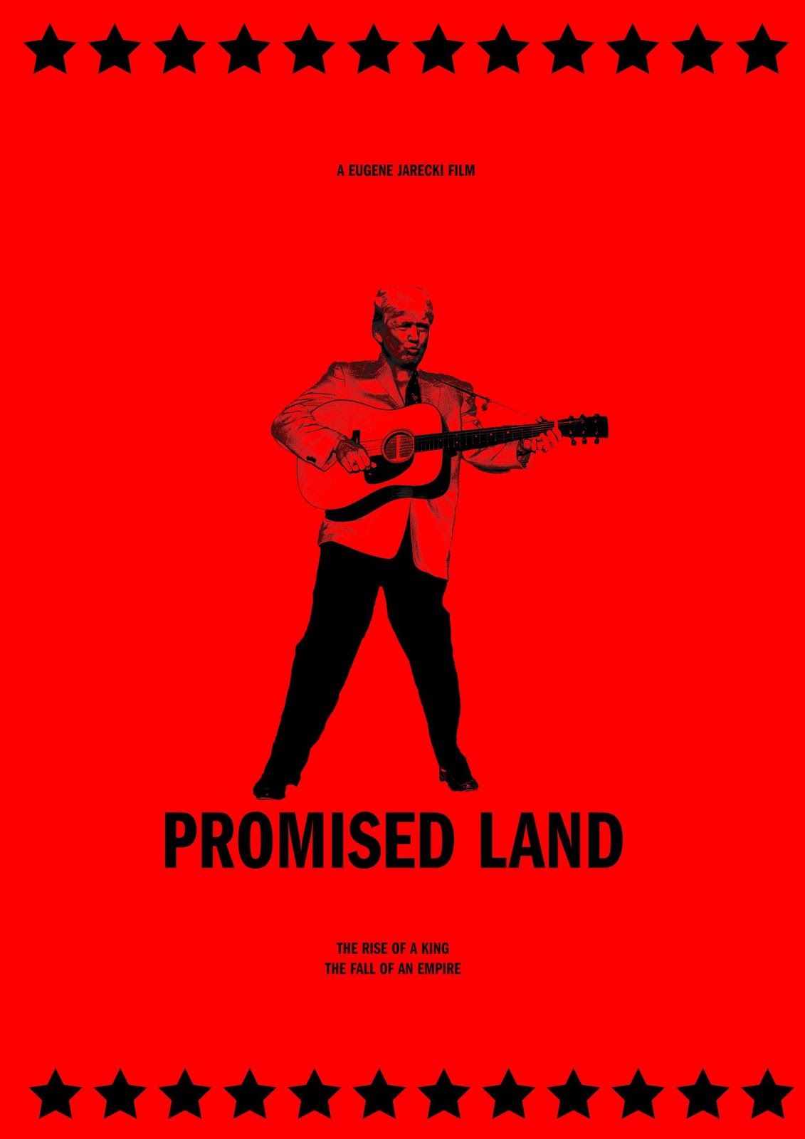 Promised land is a documentary which follows a filmmaker riding Elvis’ Rolls Royce around America during the 2016 presidential election, and while doing so, draws comparisons between Trump and Elvis. For these posters, I explored Midnight Marauders contemporary film posters: similarly to his poster for ‘Hal’ I utilised a large amount of white space within the composition, and was very sparing with the application of colour, simply having one prevailing background colour with black over the top. The imagery shows Donald trumps head on elvis’ body, playing guitar - this was done as a very simple yet astute way of representing how the two are compared in the film, and does, in doing so, communicate the movie very effectively. Its also quite funny, with trumps face he’s pulling, which would mean it would be attention grabbing. A few design decisions relate back to rock and roll posters from the 20th century from print shops such as ‘Hatch Show Print’ who letter-pressed posters for many stars, such as Elvis. These design elements include the rows of stars and the use of a narrow sans serif typeface, which they would often use to increase the amount of space on the poster. Red was tested as a colour, because its bold and evocative of America. I then went for a yellow/gold because yellow is commonly associated with independent films/documentaries and also its representative of trumps hair. It's slightly gold so that it is evocative of Elvis’ grandeur and ‘royal’ status as the king of rock.